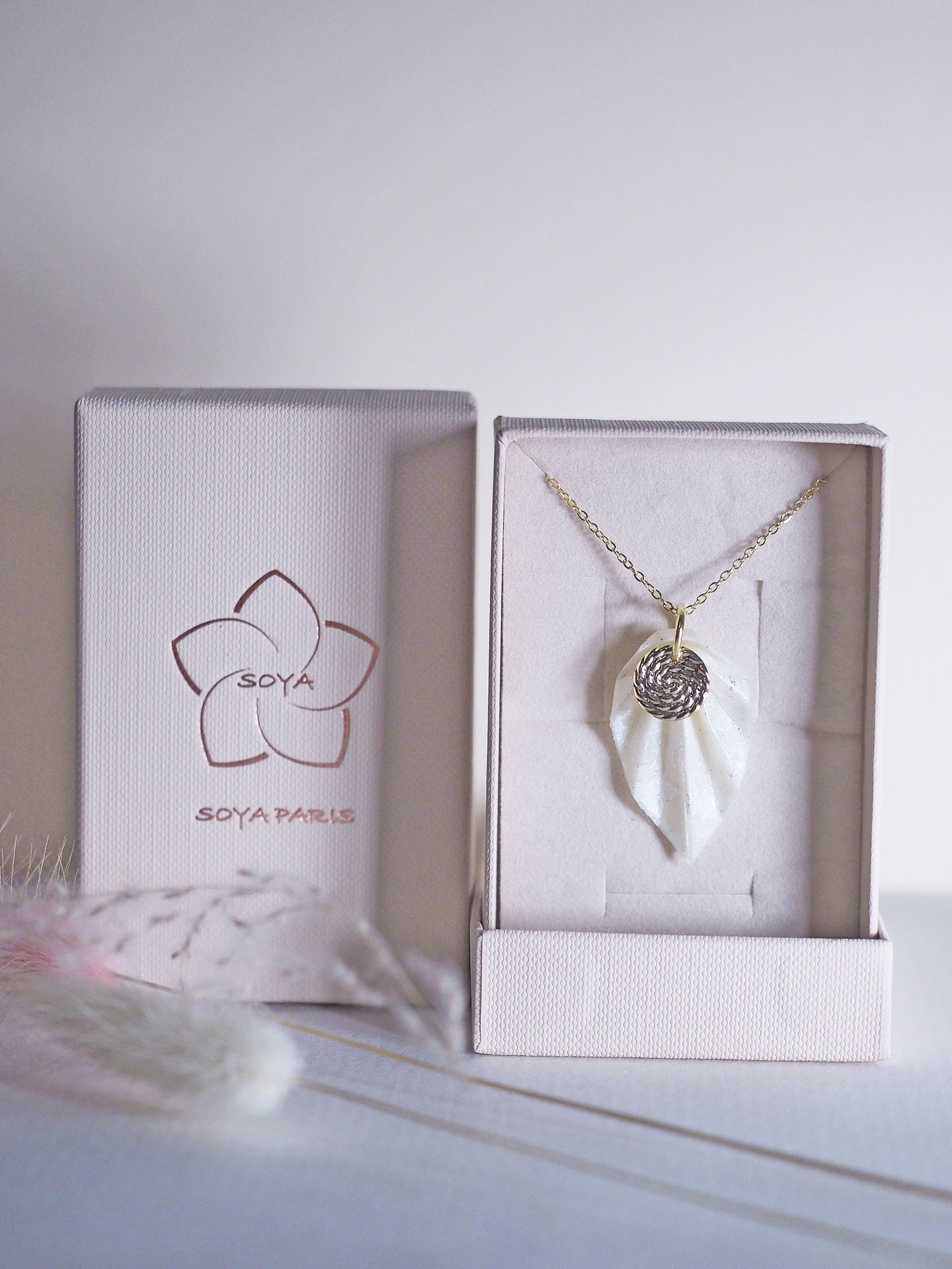 Chaque collier est plié à la main selon l’art de l’origami, revisité par Soya Paris dans une création intemporelle.